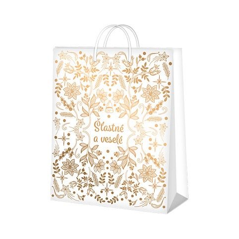 Bílá vánoční papírová taška se zlatou ražbou a nápisem Šťastné a veselé. Rozměry: 26 × 12,7 × 32,4 cm