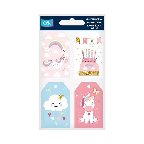 Balení 12 kusů dětských jmenovek na dárek s holčičím motivem jednorožce. Balení obsahuje 4 různé motivy vždy po 3 kusech. Rozměry dárkových jmenovek: 8 × 5 cm
