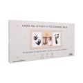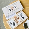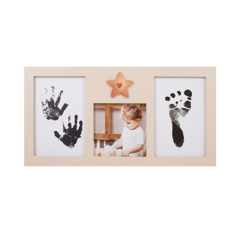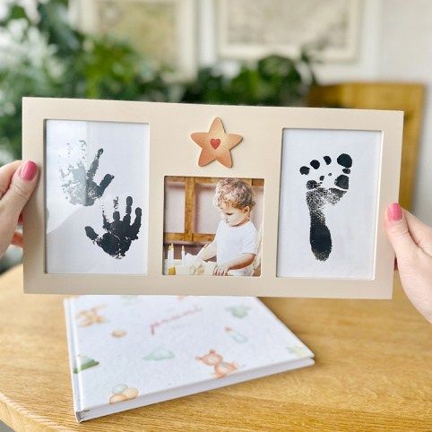 Stylový fotorámeček, který je navržen tak, aby zachytil nejen tvář vašeho děťátka, ale i otisky ručiček či nožiček. Balení obsahuje: barevný fotorámeček na fotografii a otisky, černou inkoustovou podložku na otisky, potiskové papíry a návod. Velikost rámečku: 36,8 × 19 × 1,3 cm Vhodný na fotografii o rozměru: 11 × 11 cm