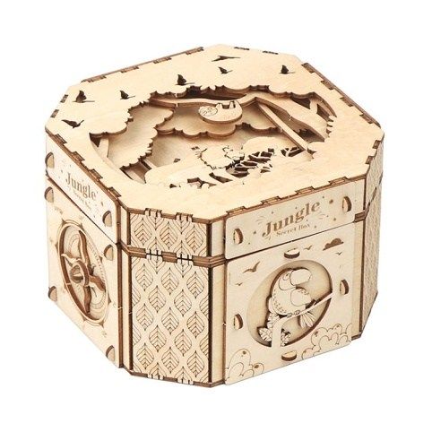 DIY hlavolam s motivy džungle se skrytou přihrádkou pro originální darování. Sestavte ho a darujte středně pokročilým milovníkům hlavolamů. Materiál: dřevo