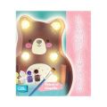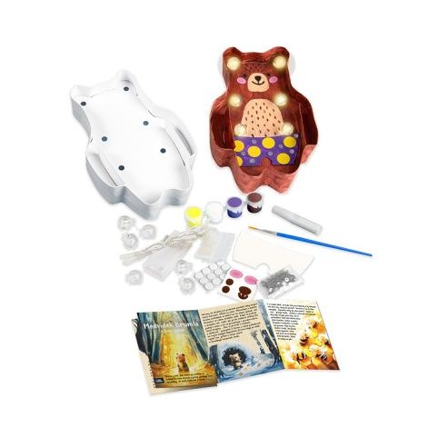DIY lampičku ve tvaru medvídka si mohou děti vyzdobit podle svého. Součástí sady je i pohádkové leporelo. Lampička je bezdrátová, baterie nejsou součástí balení. Balení obsahuje: karton ve tvaru medvídka, 4 kalíšky akrylových barev, 1 štětec, třpytkové lepidlo, svítící řetěz s LED diodamy, 6 plastových baněk na žárovky, 9 oboustranně lepících polštářků, třpytivá kolečka, kartonový základ pro kalhoty, 2 samolepkové oči, 2 samolepkové líce, 1 samolepku čenichu.
