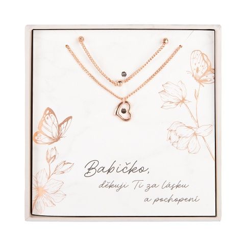 Dvojitý náhrdelník v oblíbené barvě rose gold je uložen v dárkovém balení s osobním věnováním. Upozornění: aby vám šperk dlouho vydržel jako nový, zamezte jeho styku s vodou a chemikáliemi. Materiál: měď Povrchová úprava: pozlaceno 18karátovým zlatem Délka řetízků: 45 cm, 40 cm