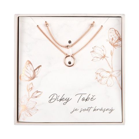 Dvojitý náhrdelník v oblíbené barvě rose gold je uložen v dárkovém balení s osobním věnováním. Upozornění: aby vám šperk dlouho vydržel jako nový, zamezte jeho styku s vodou a chemikáliemi. Materiál: měď Povrchová úprava: pozlaceno 18karátovým zlatem Délka řetízků: 45 cm, 40 cm