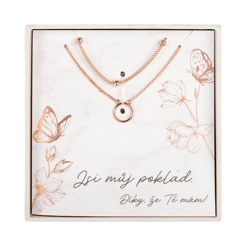 Dvojitý náhrdelník v oblíbené barvě rose gold je uložen v dárkovém balení s osobním věnováním. Upozornění: aby vám šperk dlouho vydržel jako nový, zamezte jeho styku s vodou a chemikáliemi. Materiál: měď Povrchová úprava: pozlaceno 18karátovým zlatem Délka řetízků: 45 cm, 40 cm