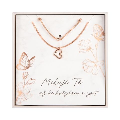 Dvojitý náhrdelník v oblíbené barvě rose gold je uložen v dárkovém balení s osobním věnováním. Upozornění: aby vám šperk dlouho vydržel jako nový, zamezte jeho styku s vodou a chemikáliemi. Materiál: měď Povrchová úprava: pozlaceno 18karátovým zlatem Délka řetízků: 45 cm, 40 cm