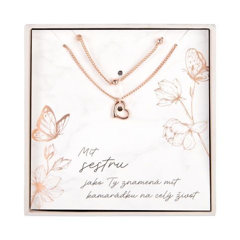 Dvojitý náhrdelník v oblíbené barvě rose gold je uložen v dárkovém balení s osobním věnováním. Upozornění: aby vám šperk dlouho vydržel jako nový, zamezte jeho styku s vodou a chemikáliemi. Materiál: měď Povrchová úprava: pozlaceno 18karátovým zlatem Délka řetízků: 45 cm, 40 cm