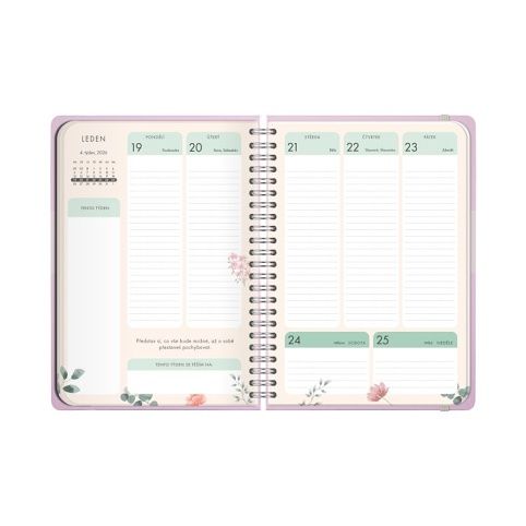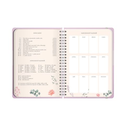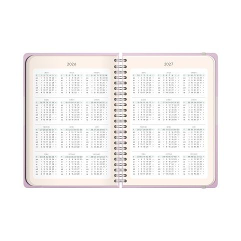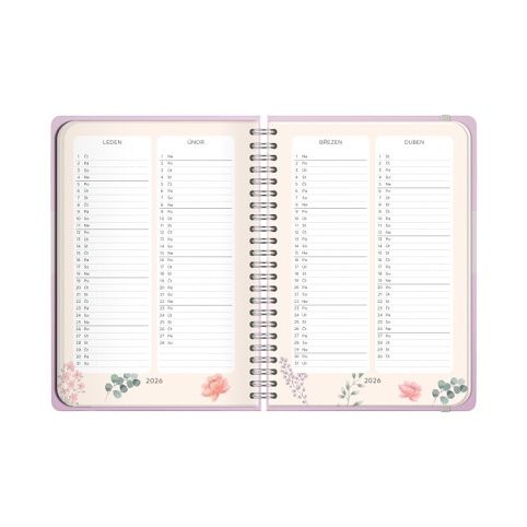 V diářích s týdenním kalendáriem je přehled roku 2026 a 2027, měsíční plánovač, státní svátky, astrologický kalendář, narozeninový kalendář a místo pro poznámky. Velikost: A5 Rozměry: 15 × 21 × 1 cm