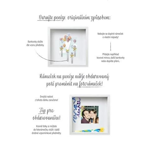 Dárkové fotorámečky na peníze jsou nejen originálním způsobem, jak darovat peníze, ale poslouží i jako klasické rámečky. Rozměry: 23 × 23 × 5,5 cm