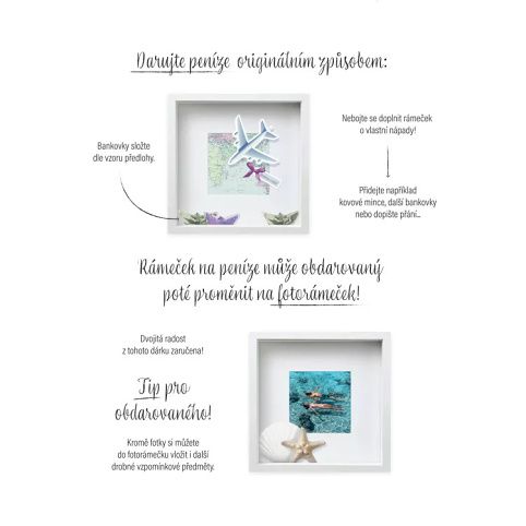 Dárkové fotorámečky na peníze jsou nejen originálním způsobem, jak darovat peníze, ale poslouží i jako klasické rámečky. Rozměry: 23 × 23 × 5,5 cm