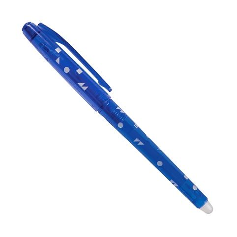 Gumovací pero s modrou vyměnitelnou náplní má pogumovaný úchyt pro pohodlné psaní i dětskou rukou.