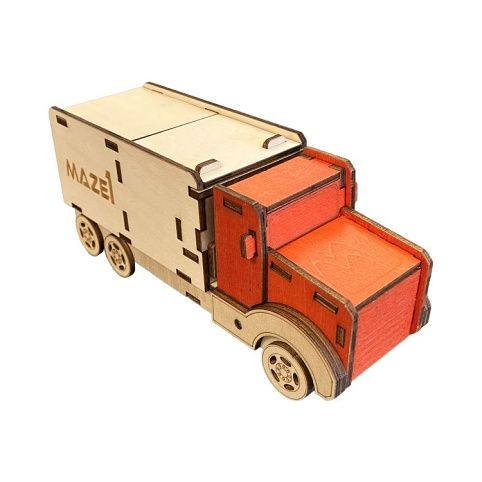 Dřevěný hlavolamový box ve tvaru náklaďáku se skrytou přihrádkou, určený k ukrytí drobných cenností. Vhodný pro experty. Materiál: dřevo Rozměry: 12,5 × 23,7 × 8,7 cm