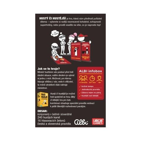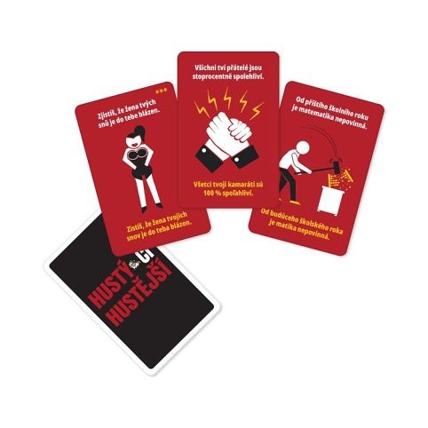 Hustý či hustější je nekorektní párty hra pro dospělé od 18 let. Budete postaveni před 2 ideální situace, vaším úkolem je vybrat si jednu z nich. Lze kombinovat s hrou Blbý či blbější. Hra obsahuje: 240 karet, 16 hlasovacích žetonů, pravidla v českém a slovenském jazyce.