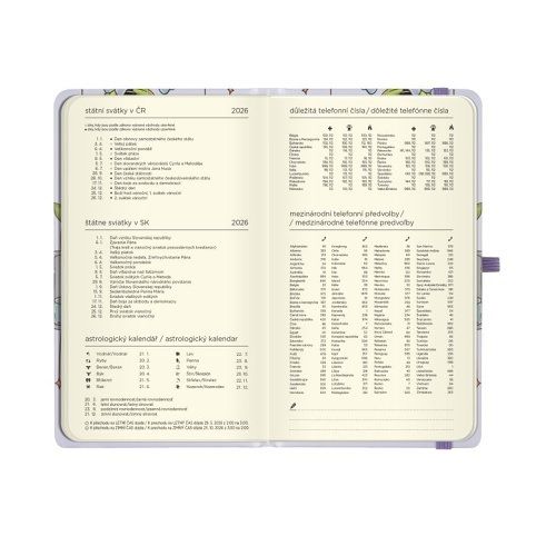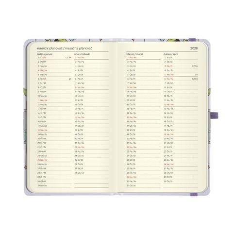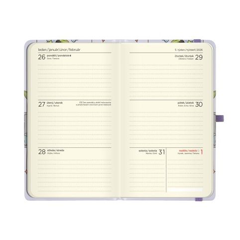 Oblíbená kapesní verze diářů je tu spolu s praktickým zavíráním na gumičku. Diářům na rok 2026 nechybí ani stuha jako záložka pro rychlou orientaci v diáři a poutko na propisku či tužku. Rozměry: 9 cm × 15,3 cm × 1,1 cm