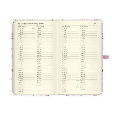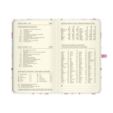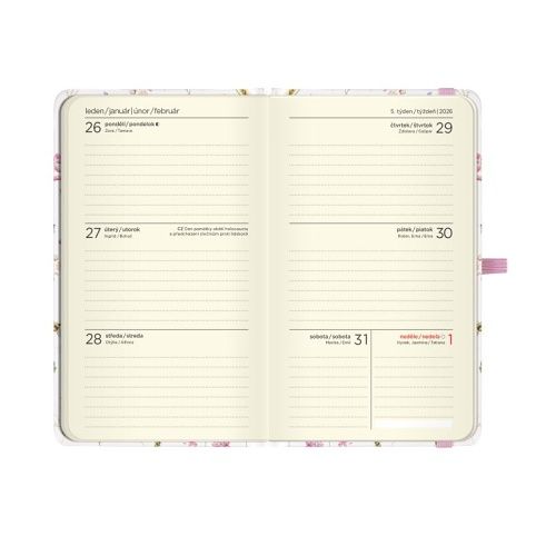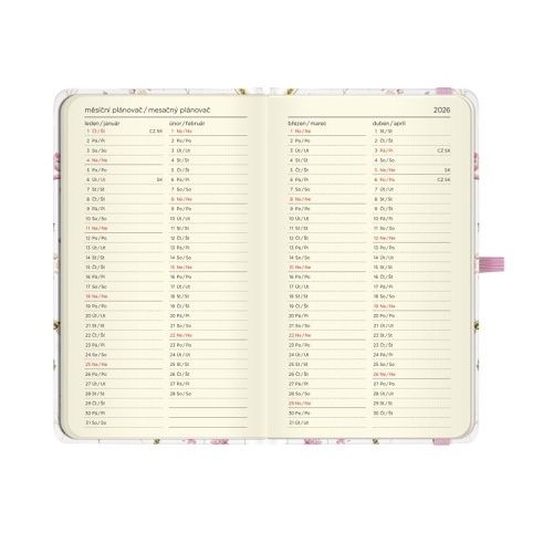 Oblíbená kapesní verze diářů je tu spolu s praktickým zavíráním na gumičku. Diářům na rok 2026 nechybí ani stuha jako záložka pro rychlou orientaci v diáři a poutko na propisku či tužku. Rozměry: 9 cm × 15,3 cm × 1,1 cm
