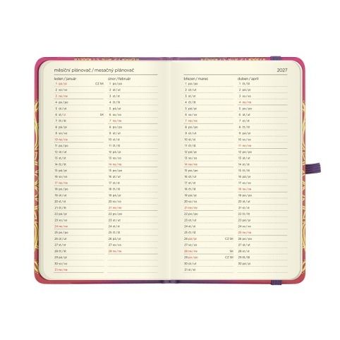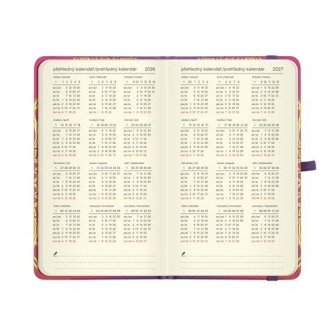 Oblíbená kapesní verze diářů je tu spolu s praktickým zavíráním na gumičku. Diářům na rok 2026 nechybí ani stuha jako záložka pro rychlou orientaci v diáři a poutko na propisku či tužku. Rozměry: 9 cm × 15,3 cm × 1,1 cm