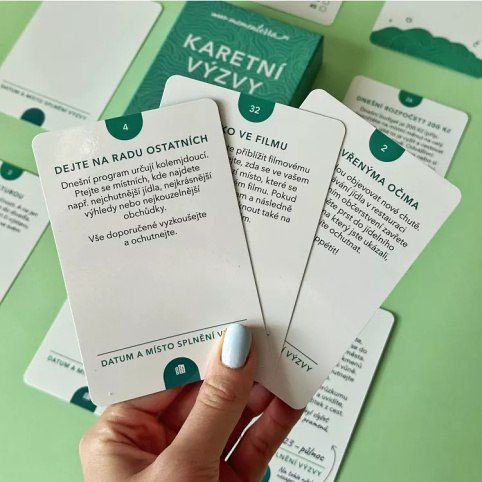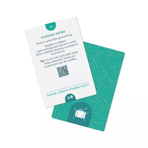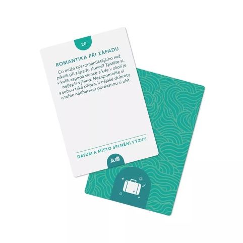 50 karet, nekonečno zážitků. Unikátní cestovatelské výzvy vám zpestří chvíle na cestách po ČR i ve světě. Vydáte se například na lov kešek, budete cestovat s rozpočtem 200 Kč nebo si necháte cíl výletu zvolit náhodným kolemjdoucím. Obsah hry: 40 karet výzev, 5 karet pro vaše vlastní výzvy, 1 kartu s otázkami k zamyšlení, 1 kartu na odškrtávání výzev, 1 kartu s tematickým citátem, 1 kartu s tematickou afirmací, 1 vzorovou kartu a pravidla pro plnění výzev.