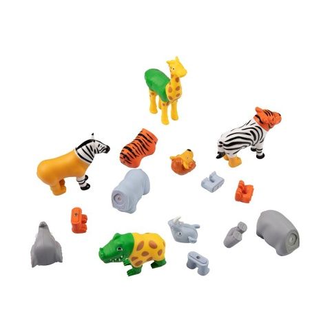 Každé ze 7 zvířat se dá rozložit na 4 části a libovolně kombinovat s dalšími zvířátky. Dílky jsou magnetické, proto u sebe pevně drží. Hra obsahuje: 7 magnetických zvířátek (tygr, zebra, žirafa, krokodýl, slon, nosorožec, lev) ze 4 částí, rozkládací hrací desku.
