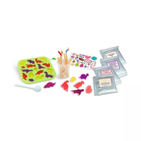 Sada na výrobu gumových bonbonů ve tvaru dinosaurů. 3 ovocné příchutě (třešňová, limetková a hroznová). Sada obsahuje: červenou třešňovou směs na kyselé gumové bonbony, fialovou hroznovou směs na kyselé gumové bonbony, žlutou limetkovou směs na kyselé gumové bonbony, želatinový prášek, silikonovou formu na bonbony, dárkové pytlíky na hotové bonbony, papírová brčka, bílou lžičku, kádinku, samolepky na zdobení dárkových pytlíku a návod s výrobním postupem.