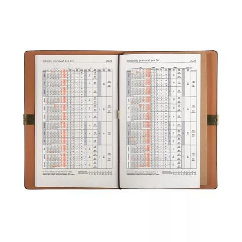 Luxusní diáře na rok 2025 mají snadné zavírání na úzkou kulatou gumičku a originální desky připomínající kožené deníky. Kalendárium je vyměnitelné. Rozměry: 12 × 17,9 × 1,5 cm Materiál: PU kůže