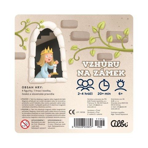 Vzhůru na zámek je magnetická hra na cesty pro 2 až 4 hráče, ve které je cílem vystoupat po schodech jako první do trůnního sálu. Hráči začínají na prvním schodu a postupují vpřed podle hodu kostkou. Cestu ovlivňují speciální pole: réva vás posune o patro výš, svíčka o tři pole vpřed, halapartna vás o tři pole vrátí a trhlina vás přesune mezi patry obousměrně. Vítězí ten, kdo jako první překoná nástrahy zámku a dorazí do cíle. Hra obsahuje: magnetický herní plán, magnetické figurky, hrací kostku.