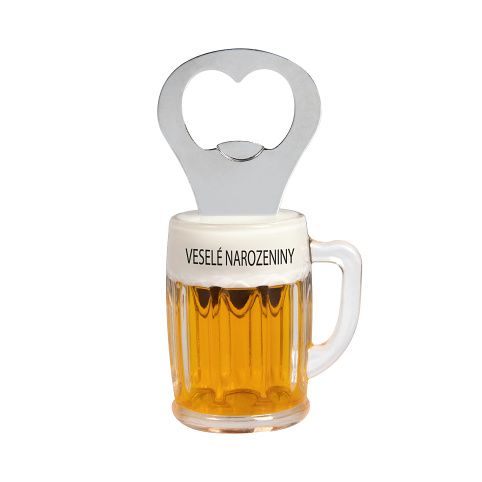 Magnetický otvírák s realistickým půllitrem piva místo rukojeti a vtipným vzkazem či věnováním.