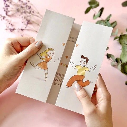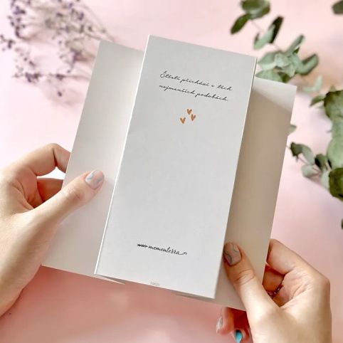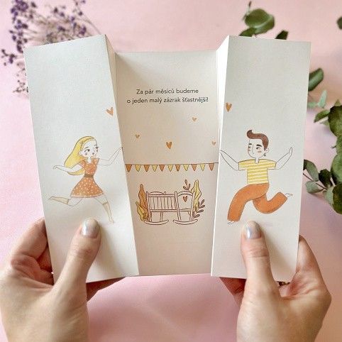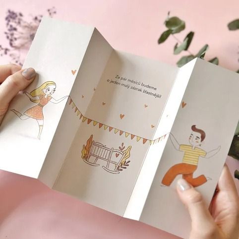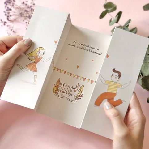 Originální otevírací přáníčko, kterým lze oznámit těhotenství. Text uvnitř: „Za pár měsíců budeme o jeden malý zázrak šťastnější!“ Rozměry: 19,5 × 13,5 cm
