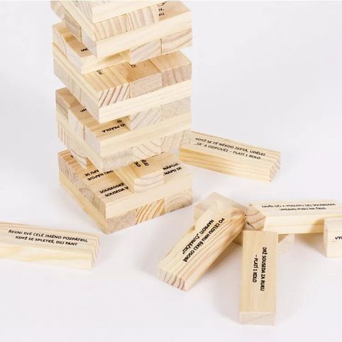Párty hra, která vás probere! Na každém hracím kameni je úkol, který musíte ihned splnit, nebo vypít svoji sklenku do dna. Komu věž spadne, čeká ho speciální trest, na kterém se předem dohodnete a fantazii se meze nekladou. Jste připraveni procvičit si zručnost a pobavit se vtipnými úkoly?
