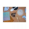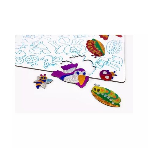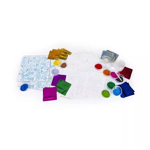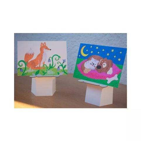 Nakombinuj dvě techniky – pískování a malování metalickými fóliemi – a vytvoř mnoho různých barevných variant obrázků a samolepek zvířátek.