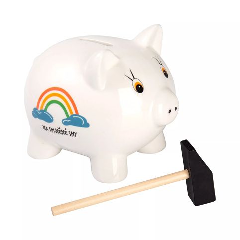 Klasické pokladničky ve tvaru prasátka s milým věnováním potěší všechny šetřílky. Součástí balení je i kladívko, které vás k vytoužené částce nakonec dostane. Materiál: Porcelán Rozměry: 14 cm × 15 cm × 16 cm