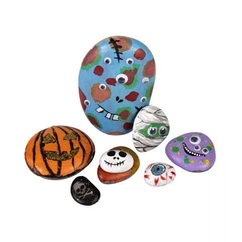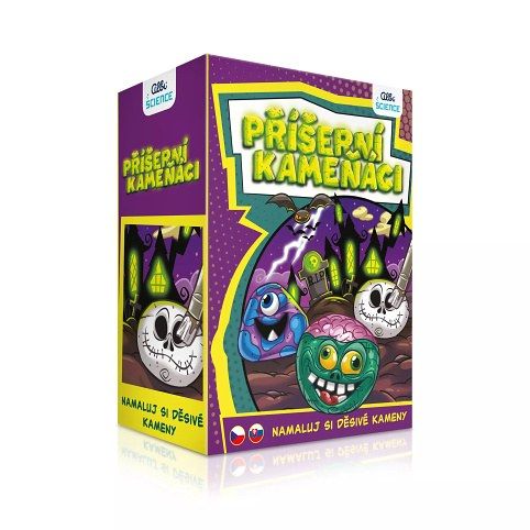 Namalujte si kameny a rovnou si je ozdobte podle sebe! Sada Příšerní kameňáci obsahuje: 7 hladkých kamenů, 12 akrylových voděodolných barev, 1 kulatý štětec, 1 plochý štětec, 4 velké nalepovací oči, 8 malých nalepovacích očí, 1 barvu, která září ve tmě, 1 arch obtisků zářících ve tmě, 1 arch obtisků.