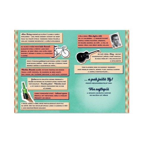 Na přání najdete zajímavé události, které se v daném roce staly, a také známé osobnosti, které se v témže roce narodily. Rozměry přáníčka: 13,5 cm × 19,5 cm
