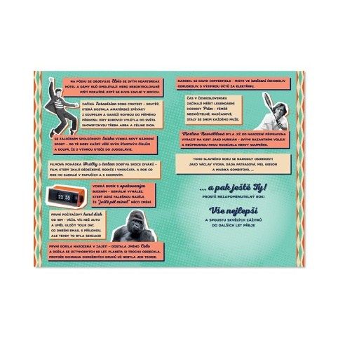 Na přání najdete zajímavé události, které se v daném roce staly, a také známé osobnosti, které se v témže roce narodily. Rozměry přáníčka: 13,5 cm × 19,5 cm