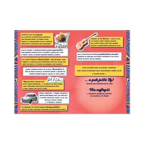 Na přání najdete zajímavé události, které se v daném roce staly, a také známé osobnosti, které se v témže roce narodily. Rozměry přáníčka: 13,5 cm × 19,5 cm