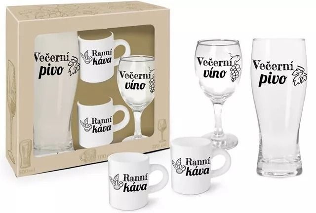 V Rodinné sadě z kolekce Můj bar si každý najde to své. Objem hrnků: 100 ml Objem vinné sklenice: 220 ml Objem půllitru: 500 ml