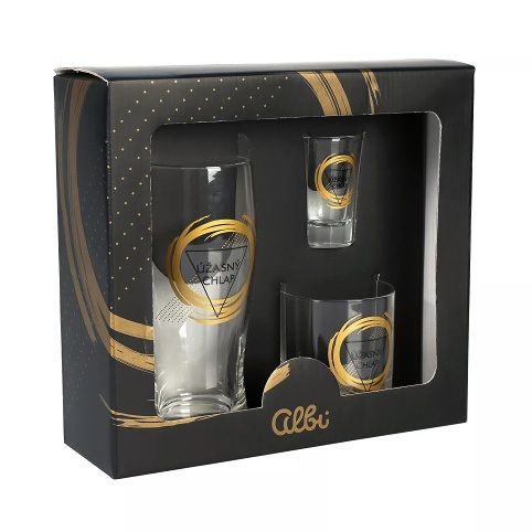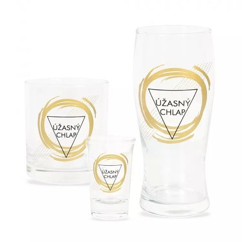 Sada sklenic na alkohol v pánském designu Mužská záležitost obsahuje sklenici na pivo, whiskey a panáka.