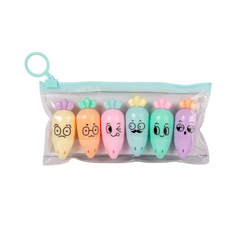 Sada 6 různobarevných zvýrazňovačů ve tvaru baby karotky je ideální pro děti do školy, nebo do hravé kanceláře. Jednotlivé barvy zvýrazňovačů: žlutá, růžová, zelená, fialová, modrá, oranžová.