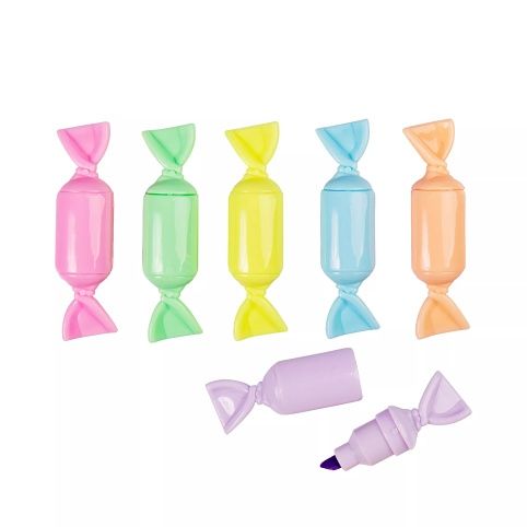 Sada obsahuje 6 kusů roztomilých zvýrazňovačů (modrý, fialový, žlutý, růžový, zelený a oranžový) ve tvaru bonbonů.
