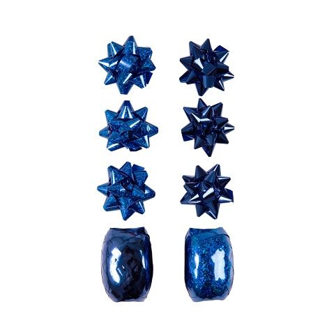 Mix metalických a holografických modrých kokard a vázacích stuh v celkové délce 40 m. Balení obsahuje: 3 metalické kokardy, 3 holografické kokardy, 1 metalickou stuhu a 1 holografickou stuhu. Šířka stuhy: 5 mm Délka stuhy: 2 × 20 m Průměr kokardy: 5 cm