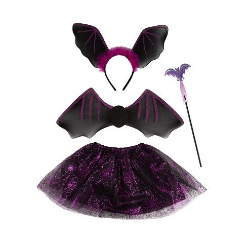 Set čtyř doplňků ve velikosti 3-4 roky je ideální k dotvoření kostýmu netopýra na tematickou párty, karneval nebo Halloween. Velikosti: 3-4 roky Materiál: 100% polyester Balení obsahuje: čelenku, hůlku, křídla a sukni Nevhodné pro děti do 3 let.