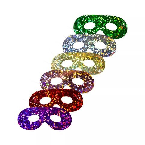 Set 6 kusů papírových škrabošek s holografickým efektem. Rozměr: 21 cm × 7,5 cm Velikost: univerzální (určeno pro dospělé i děti) Balení obsahuje: 6 ks škrabošek na obličej s gumičkou