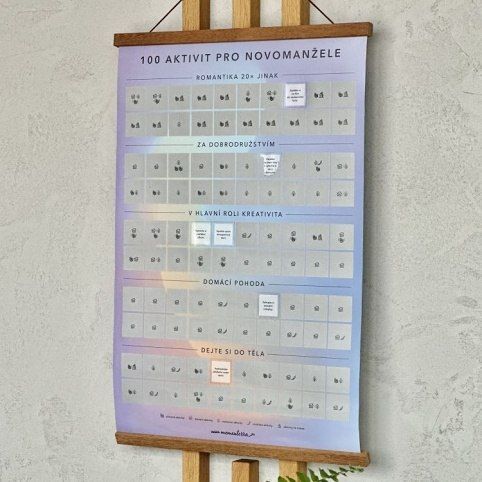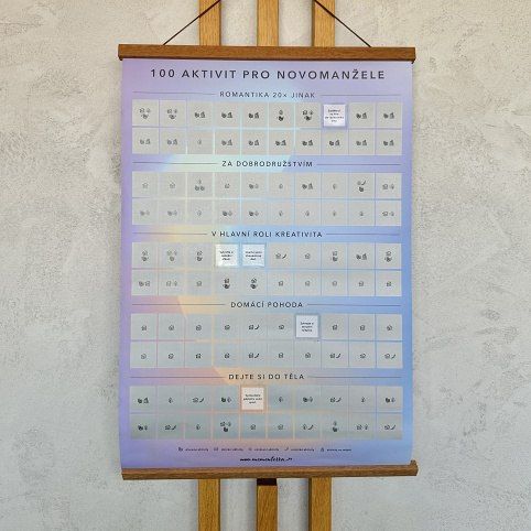 Stírací plakát se 100 aktivitami pro novomanžele. Stírací plakát - 100 aktivit pro novomanžele obsahuje: stírací plakát, dřevěný magnetický rám (41 cm) a stylové škrabátko, které udělá ze stírání ještě větší zábavu.