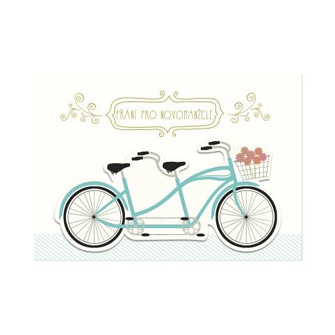 Papírové svatební přání pro novomanžele. Uvnitř přáníčka je text: Do kopce i z kopce ať provází Vás štěstí. Život je samá zatáčka, tak držíme Vám pěsti. Skvělou jízdu společným životem!