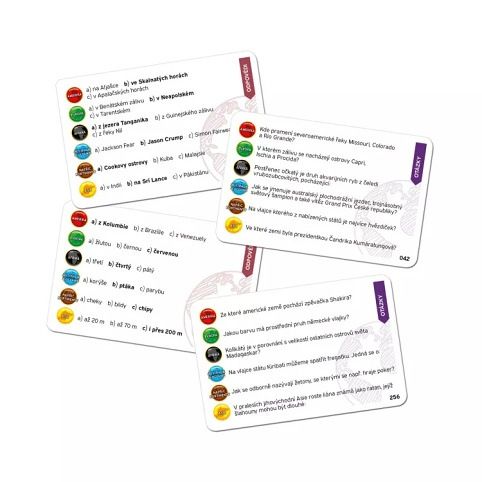 V této hře naleznete 2 400 kvízových otázek týkajících se naší planety, které jsou rozdělené do šesti okruhů: Amerika, Evropa, Afrika, Austrálie/Oceánie, Asie a Napříč kontinenty. Hra Svět - otázky a odpovědi obsahuje: 1 herní plán, 400 karet (2 400 otázek a odpovědí), 36 žetonů, 6 figurek, 1 kostka, pravidla hry.