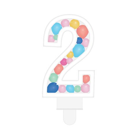 Originální dortová svíčka ve tvaru bílé číslice 2 plná barevných lentilek vesele dozdobí dort na narozeninovou oslavu či párty. Výška svíčky: 7,5 cm (8,8 cm včetně plastového zápichu) Obsah balení: 1 ks bílé svíčky s lentilkami