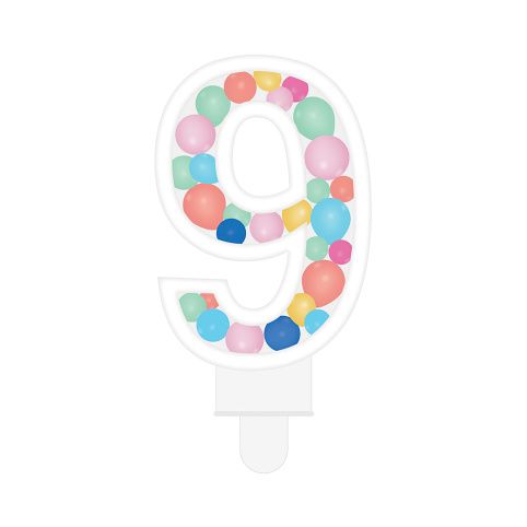Originální dortová svíčka ve tvaru bílé číslice 9 plná barevných lentilek vesele dozdobí dort na narozeninovou oslavu či párty. Výška svíčky: 7,5 cm (8,8 cm včetně plastového zápichu) Obsah balení: 1 ks bílé svíčky s lentilkami