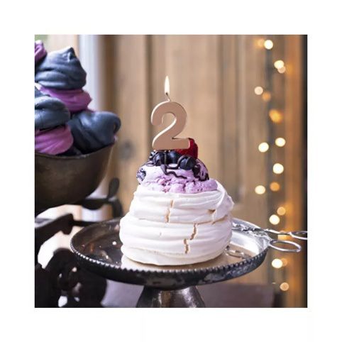 Rose gold dortová svíčka ve tvaru číslice. Výška svíčky: výška čísla 4,5 cm (celková výška včetně špejle 9 cm) Obsah balení: 1 ks svíčky na dřevěné tyčce