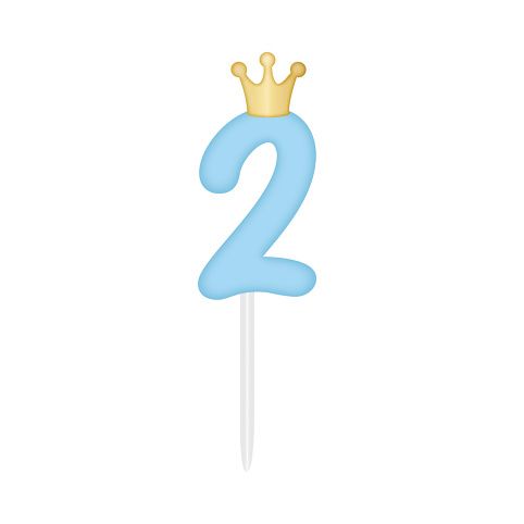 Originální dortová svíčka ve tvaru světle modré číslice 2 se zlatou korunkou stylově dozdobí dort na dětskou narozeninovou oslavu či párty. Výška svíčky: 6 cm (10,5 cm včetně plastového zápichu) Obsah balení: 1 ks modré svíčky s korunkou