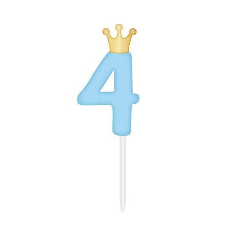 Originální dortová svíčka ve tvaru světle modré číslice 4 se zlatou korunkou stylově dozdobí dort na dětskou narozeninovou oslavu či párty. Výška svíčky: 6 cm (10,5 cm včetně plastového zápichu) Obsah balení: 1 ks modré svíčky s korunkou
