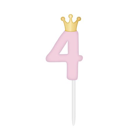 Originální dortová svíčka ve tvaru světle růžové číslice 4 se zlatou korunkou stylově dozdobí dort na dětskou narozeninovou oslavu či párty. Výška svíčky: 6 cm (10,5 cm včetně plastového zápichu) Obsah balení: 1 ks růžové svíčky s korunkou