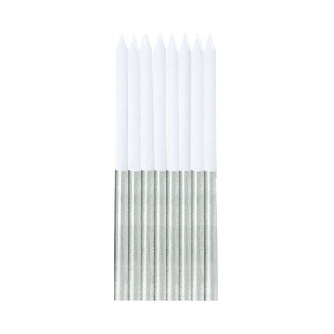Sada dortových svíček v bílé barvě s ozdobným stříbrným zakončením od poloviny svíček. Skvěle se hodí pro elegantní ozdobu narozeninového dortu. Výška svíčky: 14,5 cm Obsah balení: 16 ks svíček